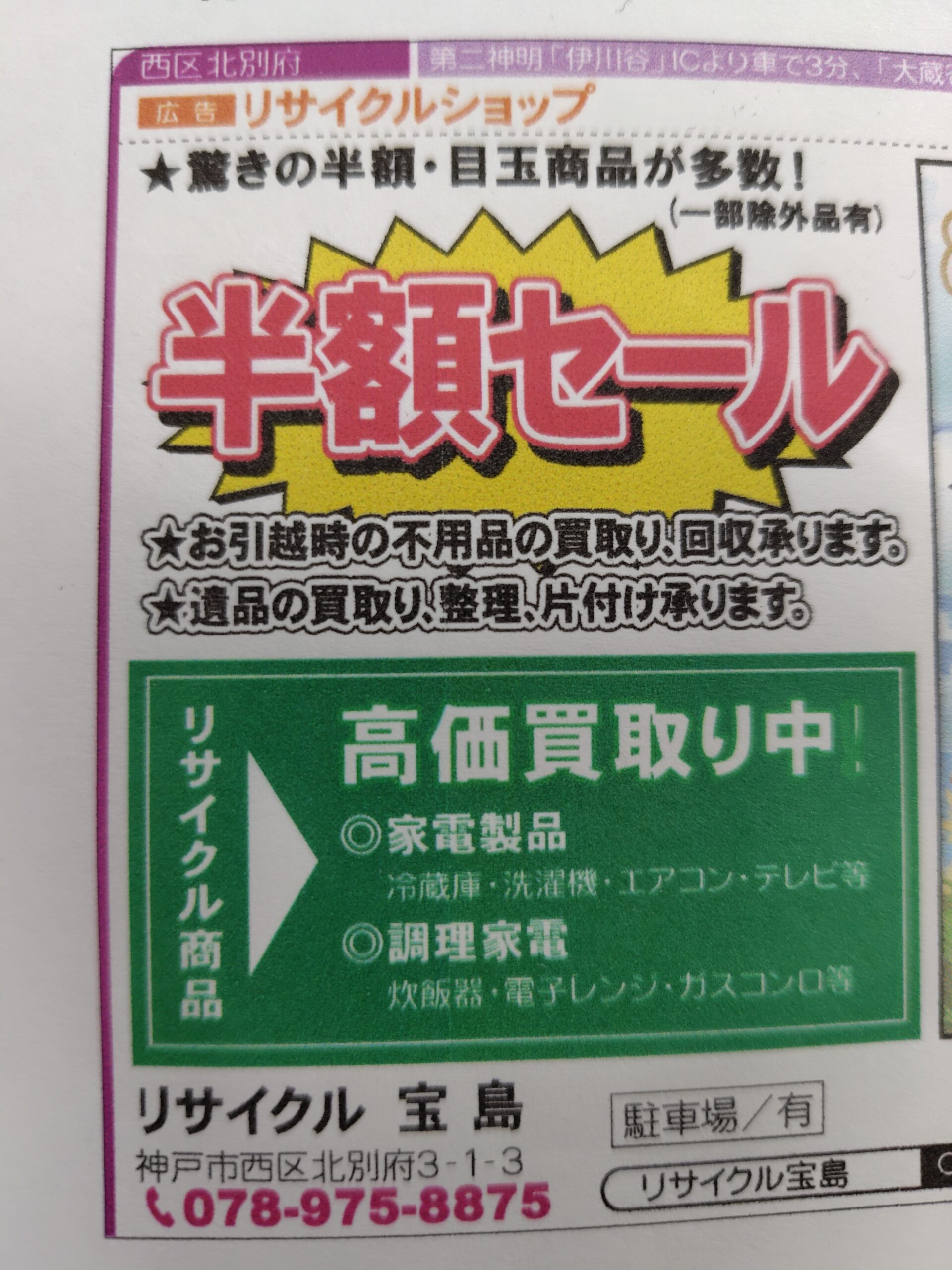 年末恒例の半額セール! 投稿者 takarajima投稿日:2025年12月13日 251207175527578 半額セール! 12月14日から12月29日まで (除外商品有り) 家具類、持ち帰り2割引 文庫本100円 着物、帯500円 年末かたづけの不要品の買い取りもしています。 よろしくお願いします。